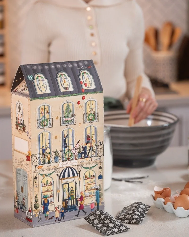 Decorative cardboard house resembling a festive building with illustrated people, windows, and a rooftop, placed on a kitchen counter with eggs, black mixing bowl, sugar sprinkles, and a person in the background mixing ingredients.